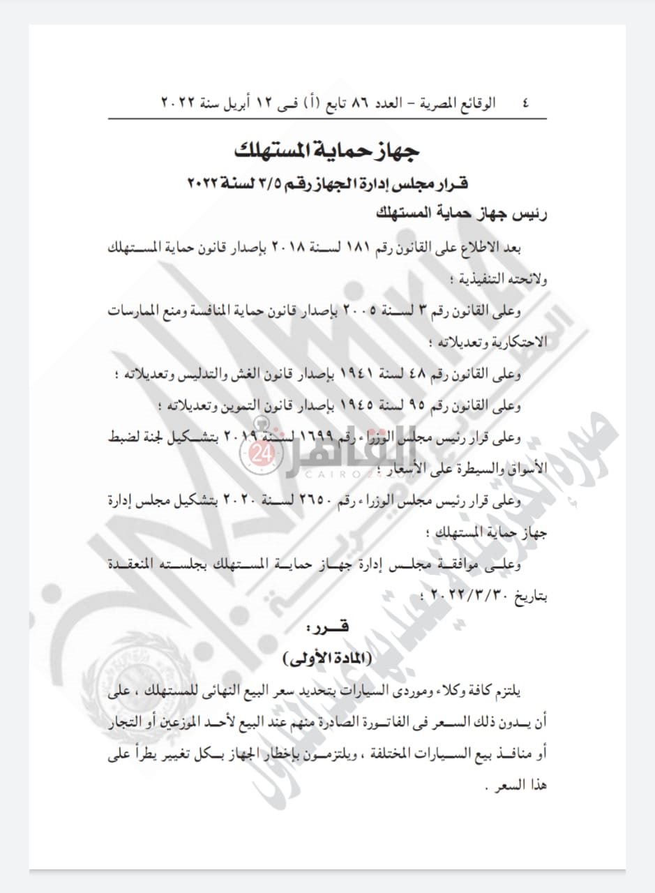 ومن خلال السطور التالية إليكم تفاصيل قرار جهاز حماية المستهلك الذي حصل القاهرة 24 على نسخة منه: