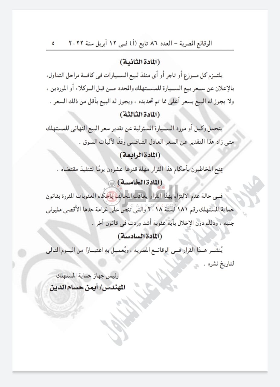 أعلن جهاز حماية المستهلك، برئاسة أيمن حسام، قرار مجلس إدارة الجهاز رقم ٣/٥ لسنة ٢٠٢٢. والذي ينص على التزام جميع موردي السيارات بتحديد سعر البيع النهائي للمستهلك، على أن يدون ذلك السعر في الفاتورة الصادرة منهم عند البيع لأحد الموزعين أو التجار أو منافذ بيع السيارات المختلفة، ويلتزمون بإخطار الجهاز بكل تغير يطرأ على هذا السعر.