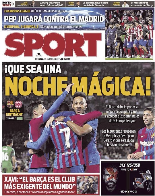 عنونت سبورت في غلافها بـ ليلة سحرية، حيث قالت الصحيفة إنه يجب أن يفرض برشلونة أفضل نسخة للفوز، والوصول إلى الدور نصف النهائي من الدوري الأوروبي