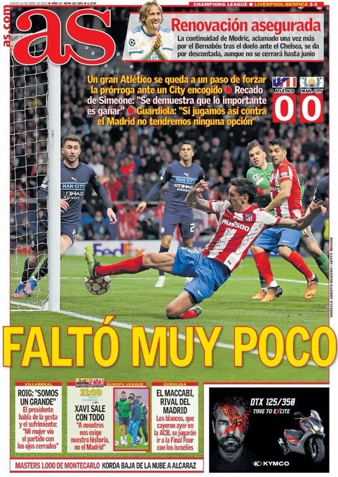 سلطت آس الضوء على أداء أتلتيكو مدريد أمس ضد مانشستر سيتي، في إياب ربع نهائي دوري أبطال أوروبا، حيث عنونت بـ القليل جدًا كان مفقودًا.