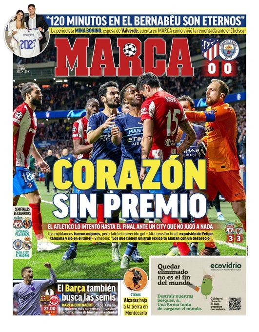 قالت ماركا في غلافها لعدد اليوم، إن مباراة أتلتيكو مدريد ومانشستر سيتي كانت مليئة بالمشاحنات، وأسفرت عن مواجهة بين ريال مدريد وبطل إنجلترا في نصف النهائي.