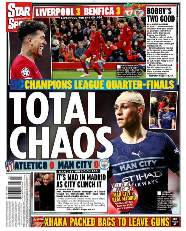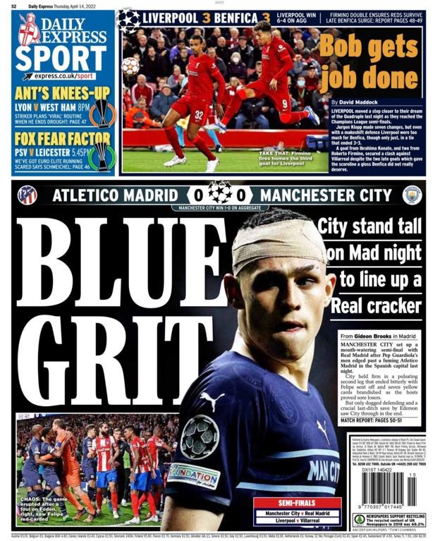 سلطت إكسبريس الضوء في غلافها على تأهل قطبي إنجلترا إلى نصف نهائي دوري أبطال أوروبا، حيث عنونت بـ مثابرة السيتي، وذلك بعد أن تخطى أبناء جوارديولا فريق أتلتيكو مدريد على ملعبه بصعوبة، فيما عنونت بـ بوبي فيرمينو ينهي وظيفته بالكامل، بعد هدفيه في بنفيكا أمس لضمان التأهل.