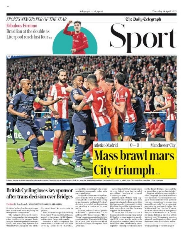 عنونت تيليجراف في غلافها اليوم بـ ثنائية البرازيلي روبرتو فيرمينو أمام بنفيكا تطير بليفربول إلى نصف النهائي، كما أشارت إلى تأهل مانشستر سيتي على حساب أتلتيكو مدريد تحت عنوان شجار ضخم بعد فوز السيتي.