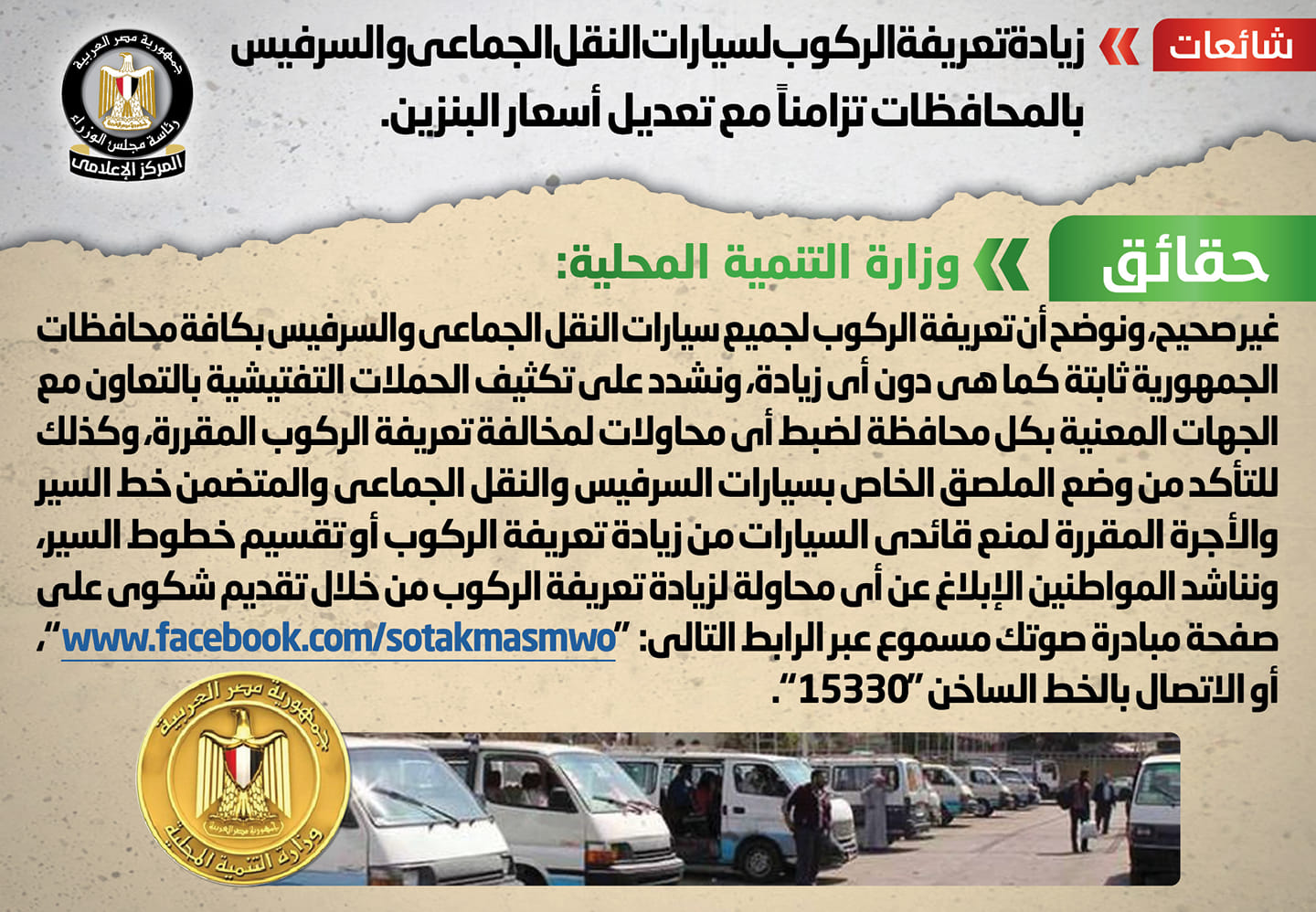 انتشرت في بعض المواقع الإلكترونية وصفحات التواصل الاجتماعي، أنباء بشأن زيادة تعريفة الركوب لسيارات النقل الجماعي والسرفيس بالمحافظات؛ تزامنا مع رفع أسعار البنزين.