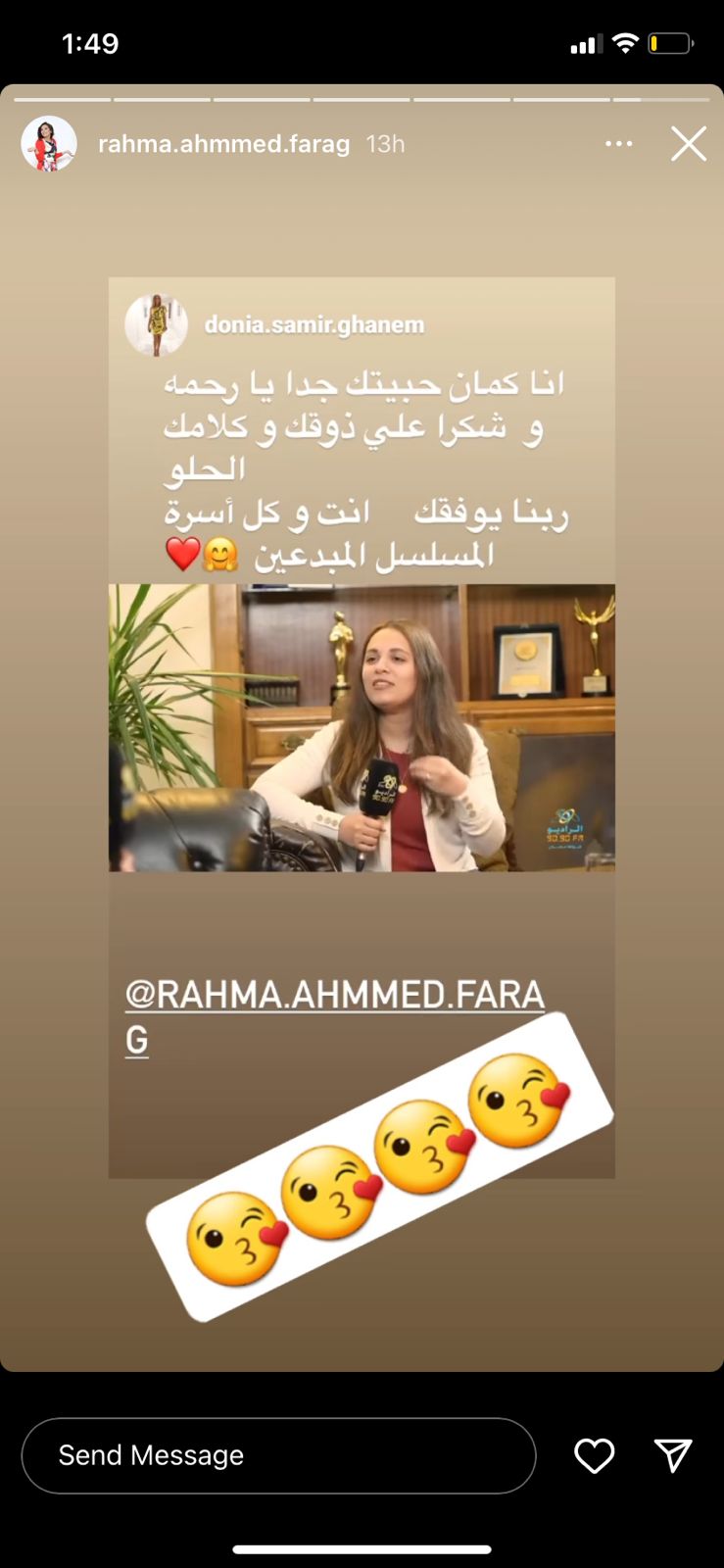 وفي وقت سابق وجهت الفنانة دنيا سمير غانم رسالة شكر عبر حسابها موقع انستجرام، ونشرت صورة لرحمة أحمد من أحد البرامج وكتبت عليها: أنا كمان حبيتك جدًا يا رحمة، وشكرا على ذوقك وكلامك الحلو، ربنا يوفقك أنت وكل أسرة المسلسل المبدعين.