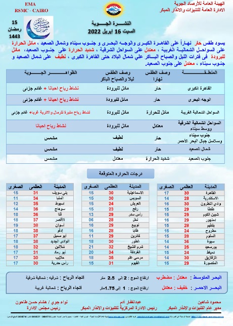 كما نشرت الهيئة العامة للأرصاد الجوية تفاصيل حالة الطقس والتقلبات الجوية المتوقعة غدًا السبت الموافق 16 أبريل الجاري، حيث ترتفع درجات الحرارة على جميع أنحاء الجمهورية ويسود معها طقس حار نهارًا على القاهرة الكبرى والوجه البحري وجنوب سيناء وشمال الصعيد، مائل للحرارة على السواحل الغربية معتدل على السواحل الشرقية، وشديد الحرارة على جنوب الصعيد.