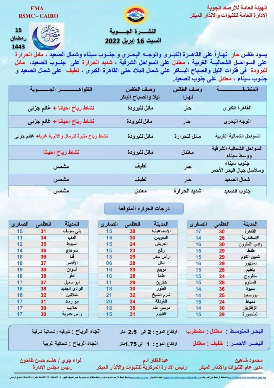 كما حذرت هيئة الأرصاد من موجة حارة تكون ذروتها يوم الأحد المقبل، الموافق 17 إبريل 2022، حيث من المتوقع ارتفاع تدريجي في درجات الحرارة، ابتداءً من غدا السبت، لتسود أجواء حارة على شمال البلاد حتى شمال الصعيد، وتزداد درجات الحرارة يوم الأحد لتسود أجواء شديدة الحرارة نهارا معتدلة ليلا على كافة الانحاء.