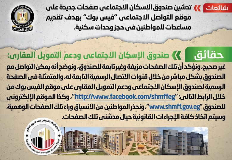 وتواصل المركز الإعلامي لمجلس الوزراء، مع صندوق الإسكان الاجتماعي، ودعم التمويل العقاري، والذي نفى تلك الأنباء، مُؤكدًا أنه لا صحة لتدشين الصندوق أي صفحات جديدة على موقع التواصل الاجتماعي فيس بوك، وأن تلك الصفحات مزيفة، وغير تابعة للصندوق.