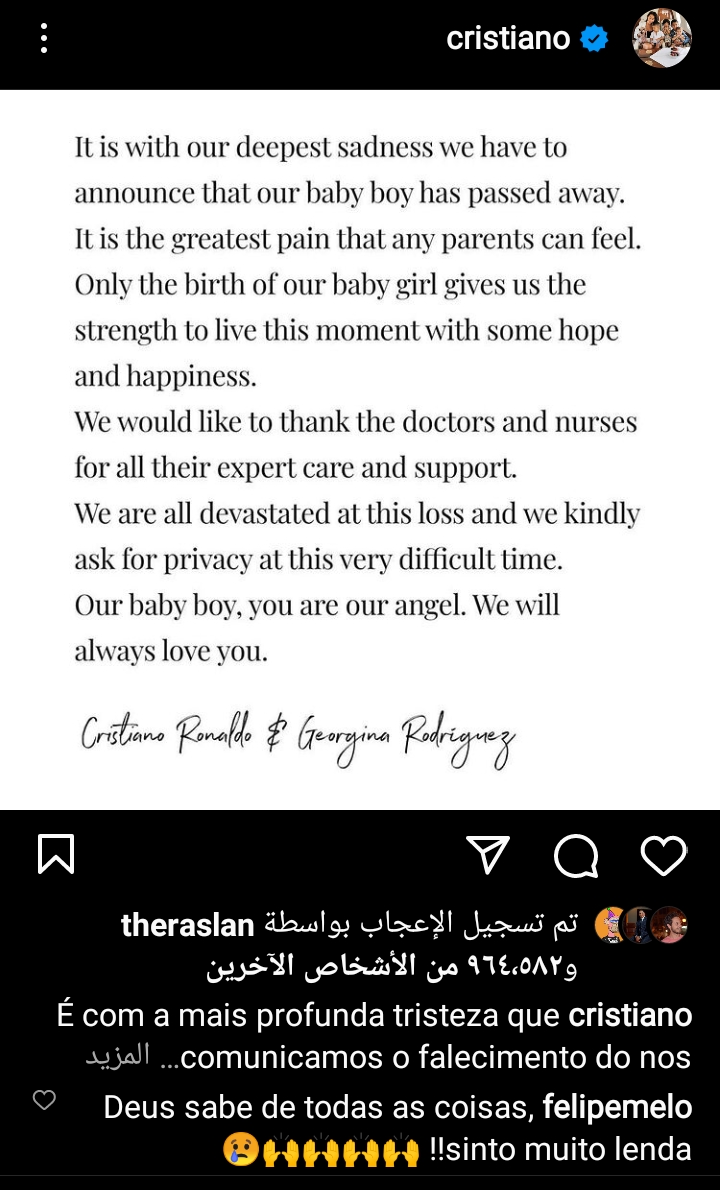 وقال الأسطورة كريستيانو رونالدو، عبر حسابه الرسمي على موقع التواصل الاجتماعي انستجرام: ببالغ الحزن، يتوّجب أن نعلن وفاة طفلنا الرضيع، إنه أكبر ألم يمكن أن يشعر به أي والدين، فقط ولادة طفلتنا هو ما منحنا القوة لنعيش هذه اللحظة ببعض الأمل والسعادة، نود أن نشكر الأطباء والممرضات على كل رعاية ودعم الخبراء.