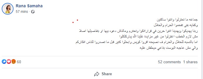 وتابعت رنا سماحة: اعتزلوا من غير مزايدة علينا الله يباركلكوا، أما بالنسبة للحلال والحرام في نصيحة، أٌقروا كويس وابحثوا كثير قبل ما تصدروا للناس أفكاركوا، واللي مش عاجبة البوست بتاعي ميعلقش عليه.