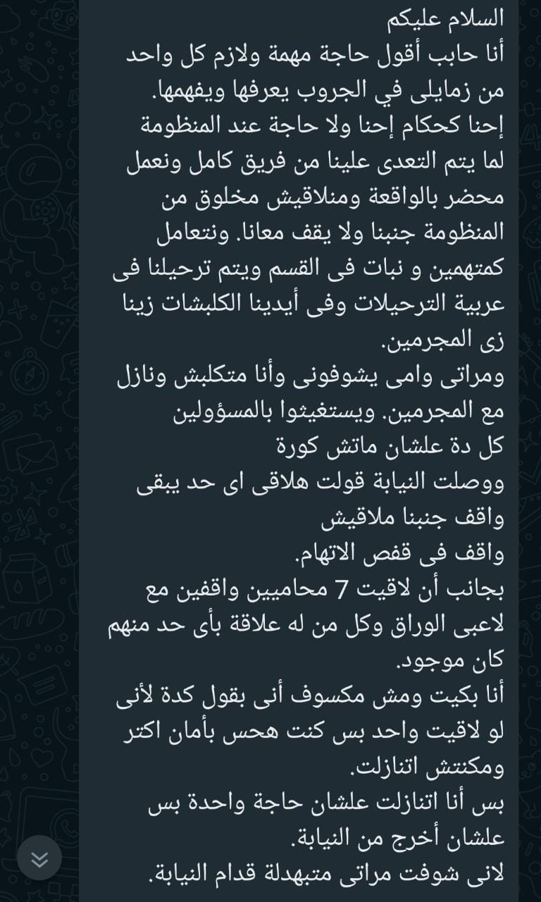 وقال عبدالناصر: أنا حابب أقول حاجة مهمة ولازم كل واحد من زمايلى في الجروب يعرفها ويفهمها، إحنا كحكام إحنا ولا حاجة عند المنظومة، لما يتم التعدي علينا من فريق كامل ونعمل محضر بالواقعة ومنلاقيش مخلوق من المنظومة جنبنا ولا يقف معانا، ونتعامل كمتهمين ونبات فى القسم ويتم ترحيلنا فى عربية الترحيلات وفى أيدينا الكلبشات زينا زي المجرمين.