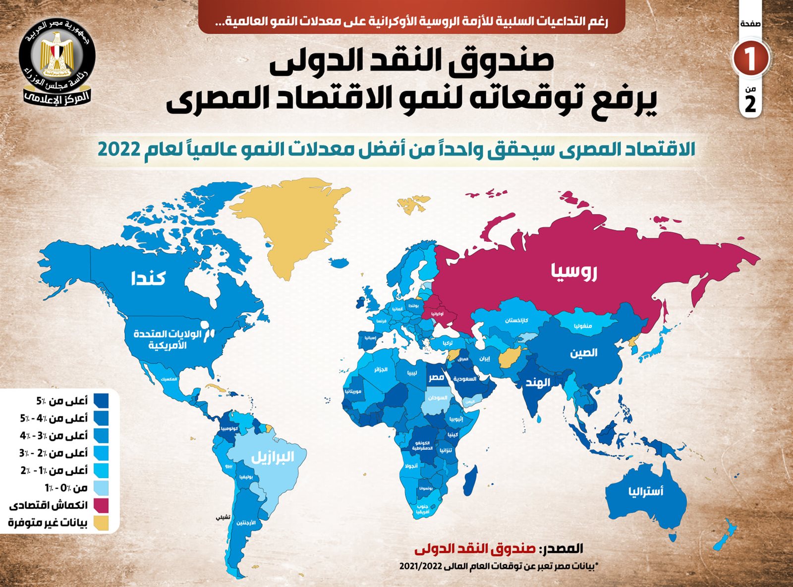نشر المركز الإعلامي لـمجلس الوزراء تقريرا تضمن إنفوجرافات، تسلط الضوء على رفع صندوق النقد الدولي توقعاته لنمو الاقتصاد المصري، رغم التداعيات السلبية للأزمة الروسية الأوكرانية على معدلات النمو العالمية.