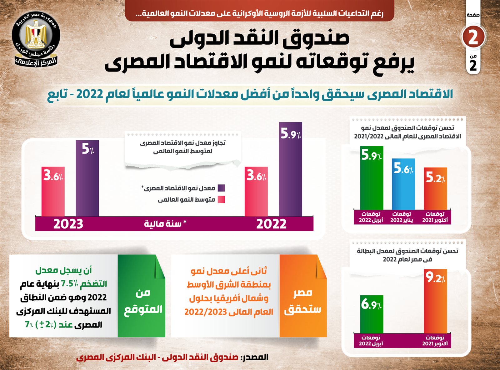 يأتي هذا في ظل توقع صندوق النقد الدولي أن يسجل معدل التضخم 7.5% بنهاية عام 2022، وهو ضمن النطاق المستهدف للبنك المركزي المصري عند 7% (±2%)، وبشأن معدل البطالة لعام 2022، سيسجل 6.9% في توقعات أبريل لعام 2022، مقارنة بـ 9.2% في توقعات أكتوبر 2021.
