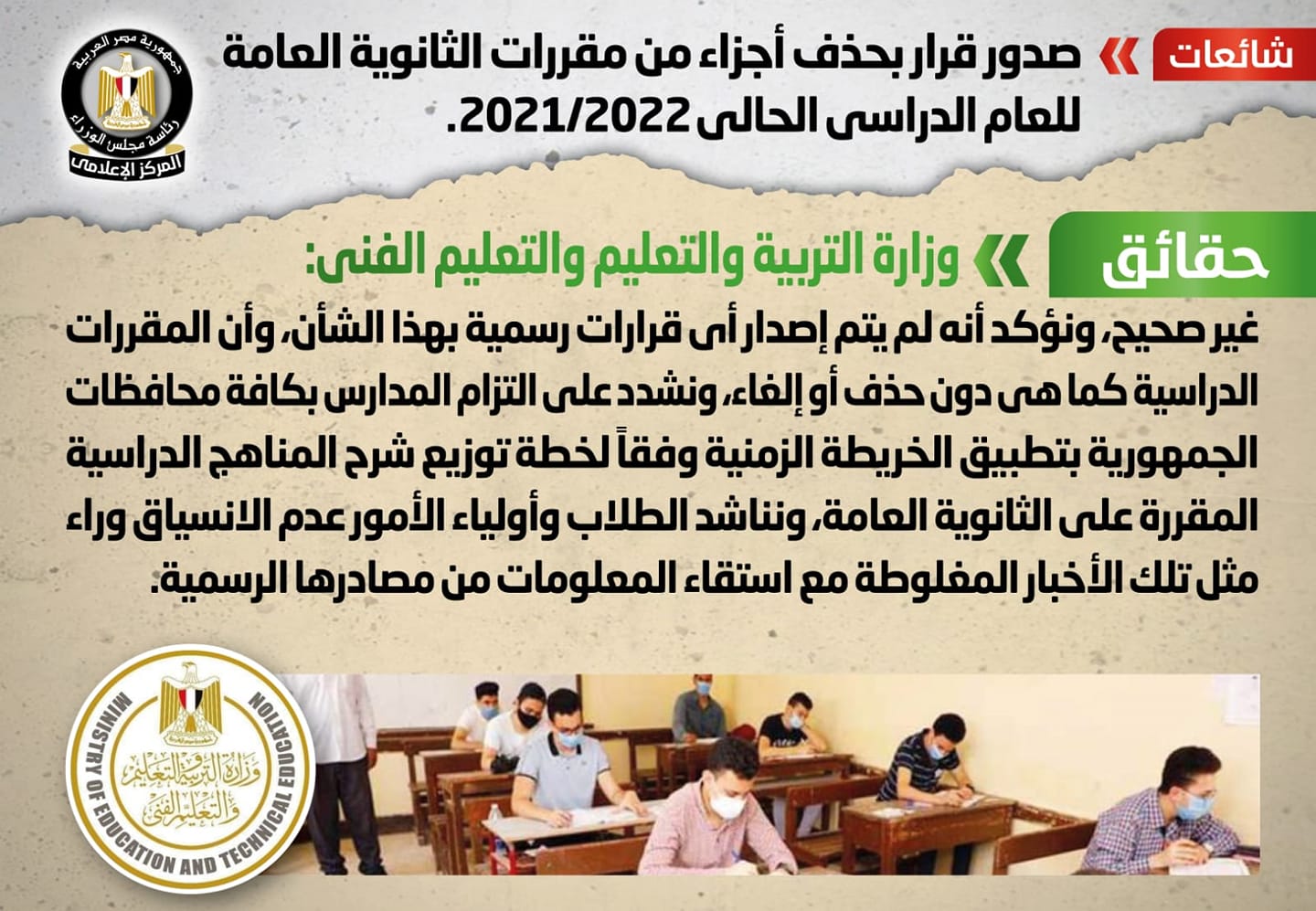 وتواصل المركز الإعلامي، لمجلس الوزراء، مع وزارة التربية والتعليم والتعليم الفني، والتي نفت تلك الأنباء، مُؤكدةً أنه لا صحة لصدور قرار بحذف أي أجزاء من مقررات الثانوية العامة للعام الدراسي الحالي 2021-2022، وأنه لم يتم إصدار أي قرارات رسمية بهذا الشأن، وأن المقررات الدراسية كما هي دون حذف أو إلغاء.