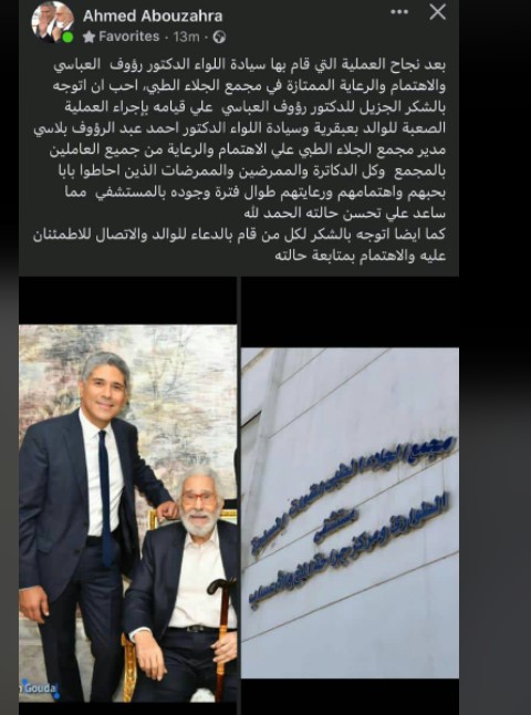 بعد خروج والده من المستشفى.. أحمد أبو زهرة يشيد بالرعاية الطبية في مجمع الجلاء الطبي