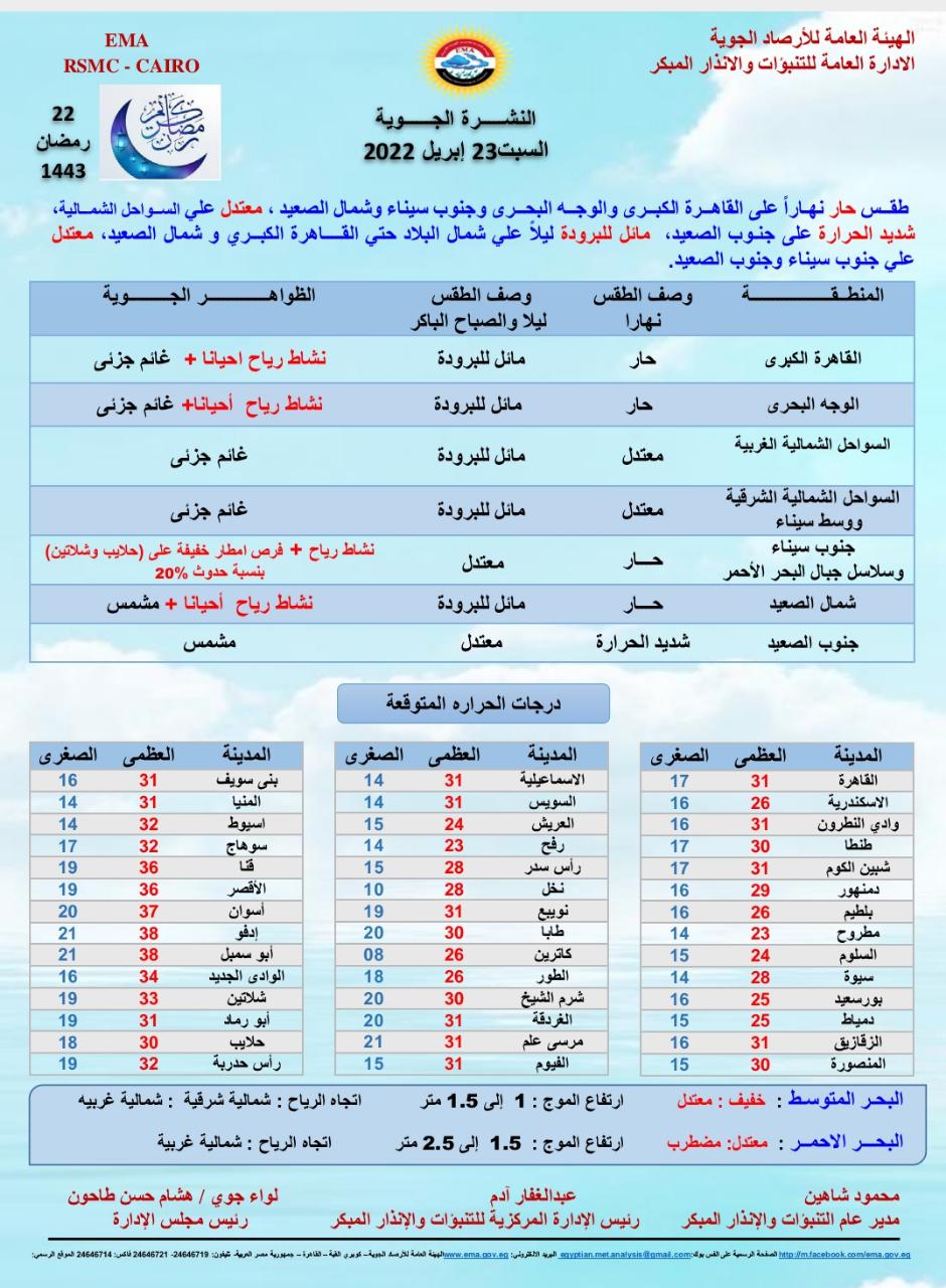 أعلنت الهيئة العامة للأرصاد الجوية عن حالة الطقس غدًا السبت الموافق 23 أبريل عام 2022، حيث من المتوقع مزيد من ارتفاع درجات الحرارة، والتي بدأت منذ اليوم الجمعة، نتيجة تأثير كتل هوائية قادمة من شبه الجزيرة العربية.