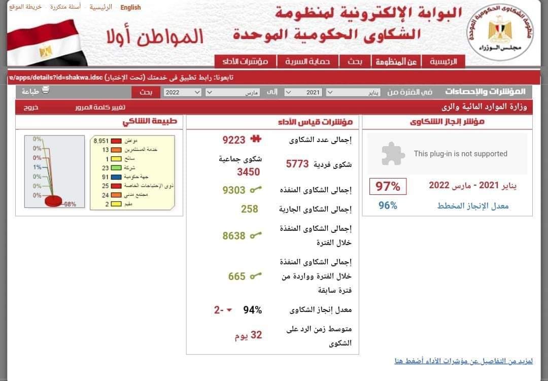 قالت وزارة الموارد المائية والري، إن منظومة الشكاوي الحكومية الموحدة أوضحت أن مؤشر إنجاز الشكاوي للوزارة بمعدل إنجاز يفوق المخطط.