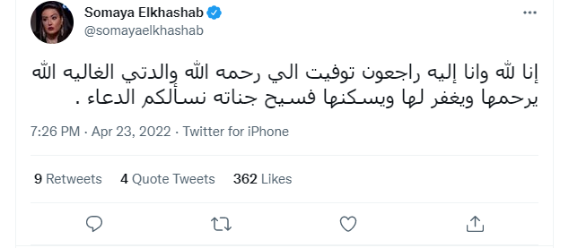 وكتبت سمية الخشاب، منشورًا عبر حسابه الشخصي بموقع التغريدات القصيرة تويتر، قائلة: إنا لله وانا إليه راجعون توفيت إلى رحمه الله والدتي الغالية الله يرحمها ويغفر لها ويسكنها فسيح جناته نسألكم الدعاء.
