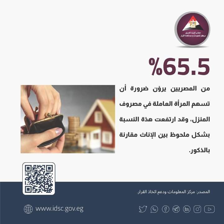 نشر مركز المعلومات ودعم اتخاذ القرار بـ مجلس الوزراء عبر صفحته الرسمية على موقع التواصل الاجتماعي فيسبوك، انفوجراف، بشأن استطلاع راي أجراه المركز حول مساهمة المرأة العاملة في مصروف المنزل.