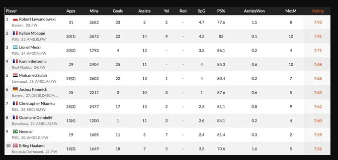 ويتصدر مهاجم بايرن ميونيخ روبرت ليفاندوفسكي الترتيب بمتوسط تقييم مباراة يبلغ 7.93، يليه نجم باريس سان جيرمان كيليان مبابي برصيد 7.91، ثم زميله في الفريق ليونيل ميسي في المركز الثالث في القائمة بمتوسط تقييم يبلغ 7.71 من أصل 10، وجاء مهاجم ريال مدريد كريم بنزيما، المرشح الأوفر حظًا للفوز بجائزة الكرة الذهبية هذا العام، في المركز الرابع في القائمة بمتوسط تقييم 7.68.
