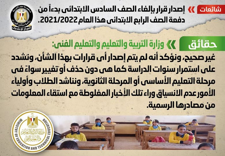 وتواصل المركز الإعلامي لمجلس الوزراء، مع وزارة التربية والتعليم والتعليم الفني، والتي نفت تلك الأنباء، مُؤكدةً أنه لا صحة لإلغاء الصف السادس الابتدائي، وأنه لم يتم إصدار أي قرارات بهذا الشأن.
