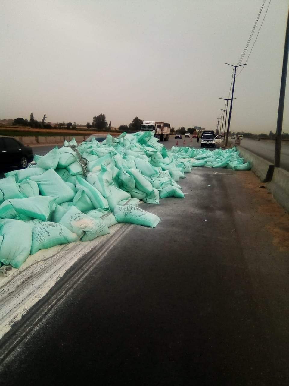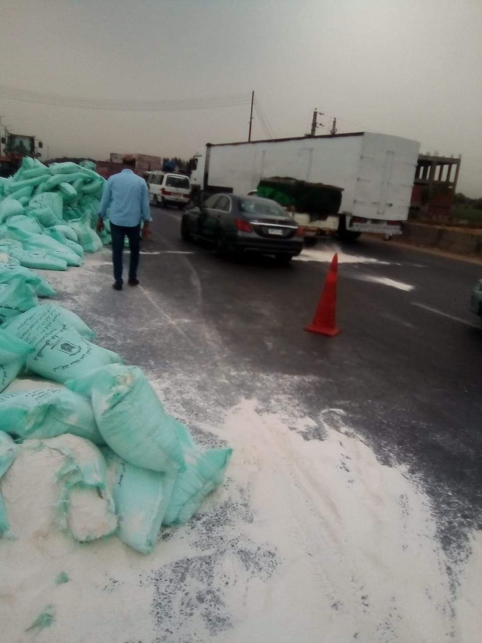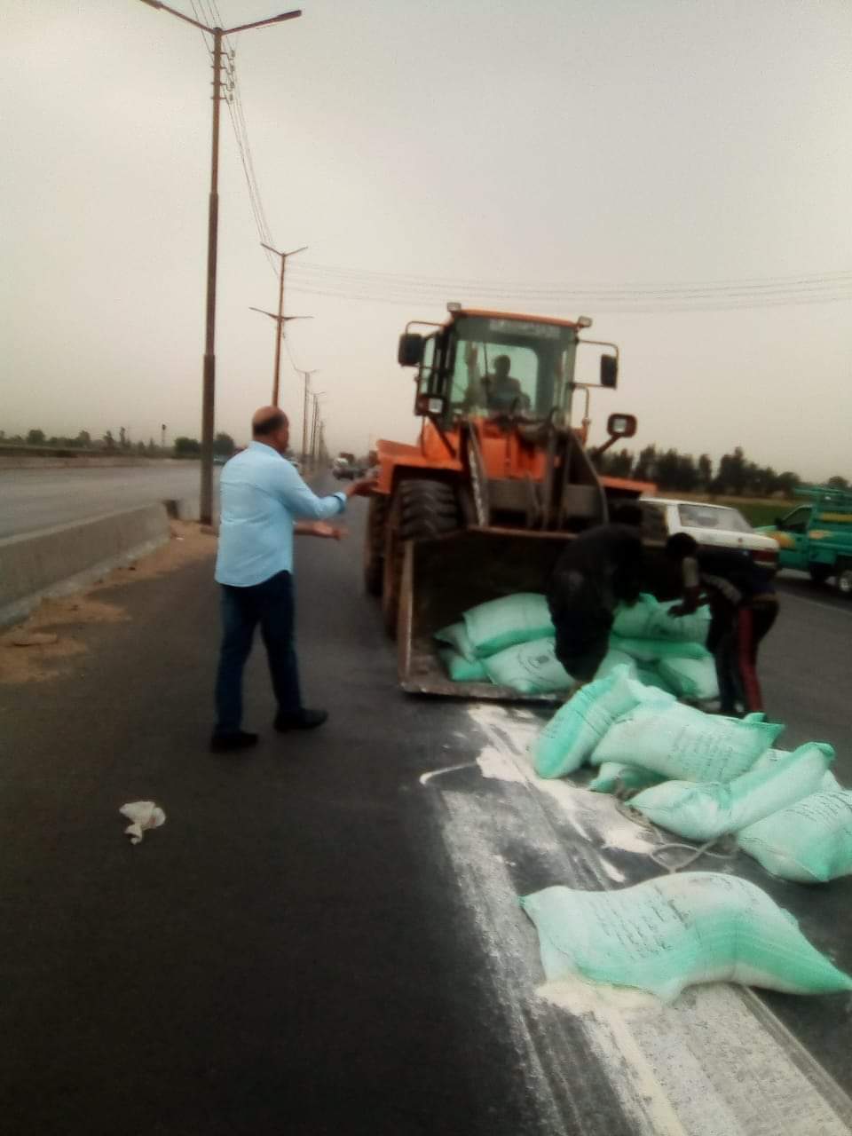 عودة الحركة للطريق الزراعي بعد حادث انقلاب سيارة محملة بـ 20 طن دقيق