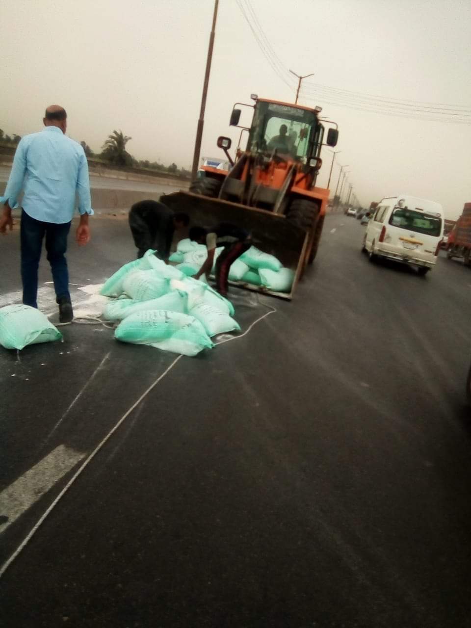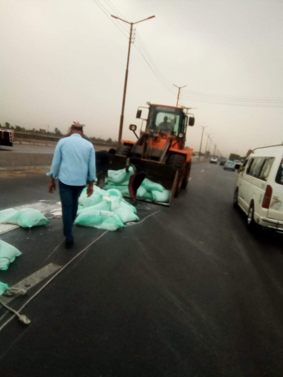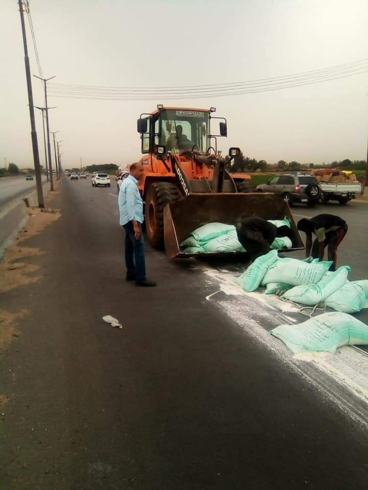 عودة الحركة للطريق الزراعي بعد حادث انقلاب سيارة محملة بـ 20 طن دقيق