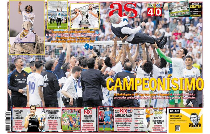 قالت آس في غلافها، إن مدريد فاز بلقب الدوري 35 بعد فوزه على إسبانيول، وذكرت أن أنشيلوتي هو المدرب الوحيد الذي فاز بالدوري في البطولات الخمس الكبرى.