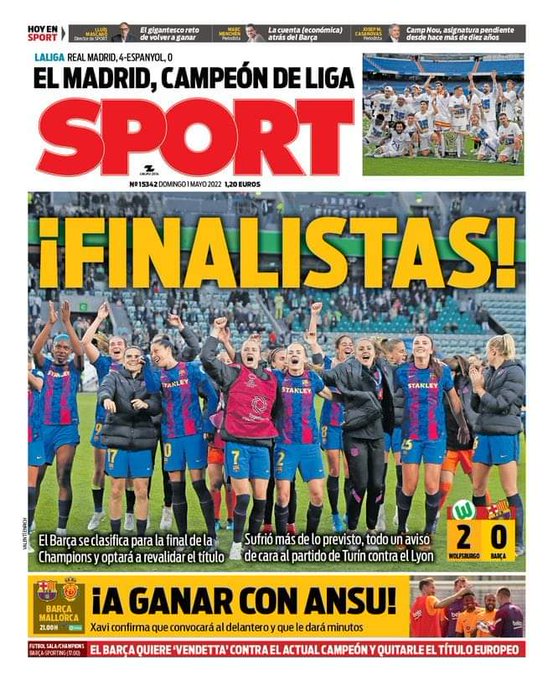 سلطت الصحيفة الضوء على تتويج ريال مدريد بالليجا، تحت عنوان ليجا بلانكوس، كما عنونت موندو ديبورتيفو في غلافها اليوم، بـ عودة فاتي، وقالت إنه سيكون لفاتي دقائق مع برشلونة الذي يحتاج إلى تغيير صورته السيئة.
