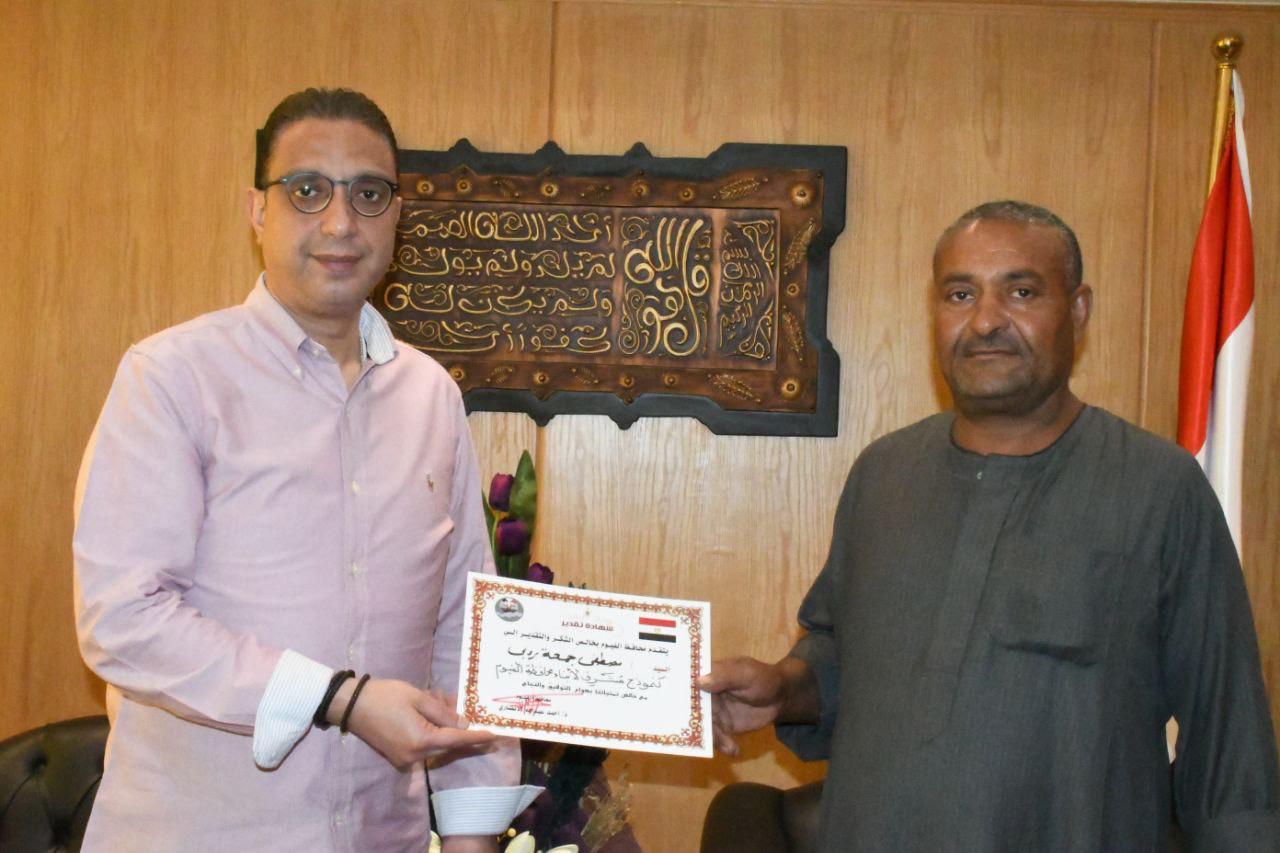 نموذج مشرف.. محافظ الفيوم يكرم مصطفى جمعة لتنازله عن مبلغ مالي من حياة كريمة لصالح مرضى الأورام