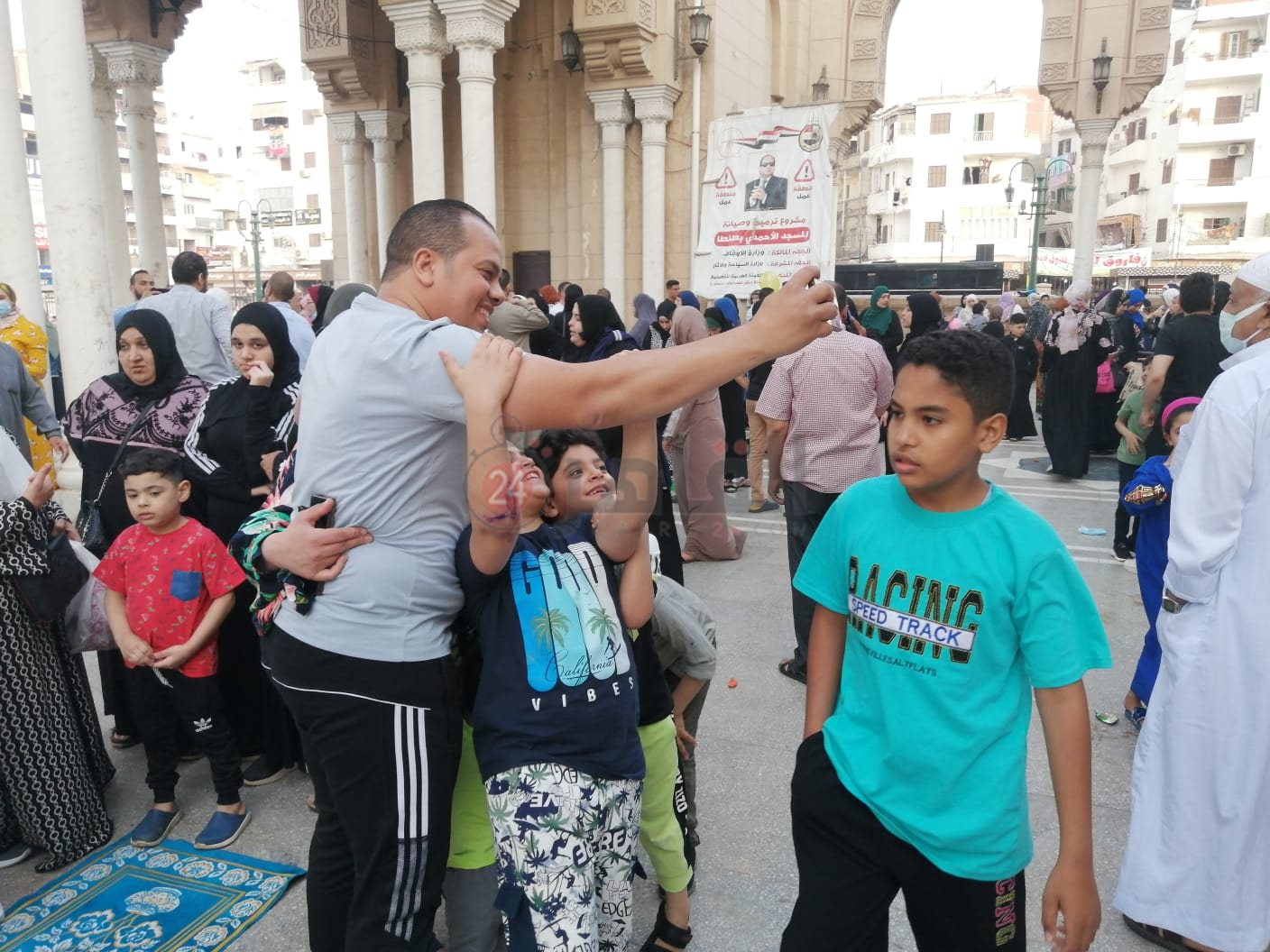 شهدت ساحة مسجد السيد البدوي بطنطا بمحافظة الغربية أجواء من الفرحة والاحتفالات حيث حرص العشرات من المصلين على التقاط السيلفي، فيما وزع عدد منهم عددا من البلالين والألعاب الترفيهية على الأطفال لرسم البسمة على وجوهم احتفالا بالعيد، وتصدر مشهد الأطفال الساحات في صلاة العيد، كما علت البلالين الطايرة فوق المصلين.