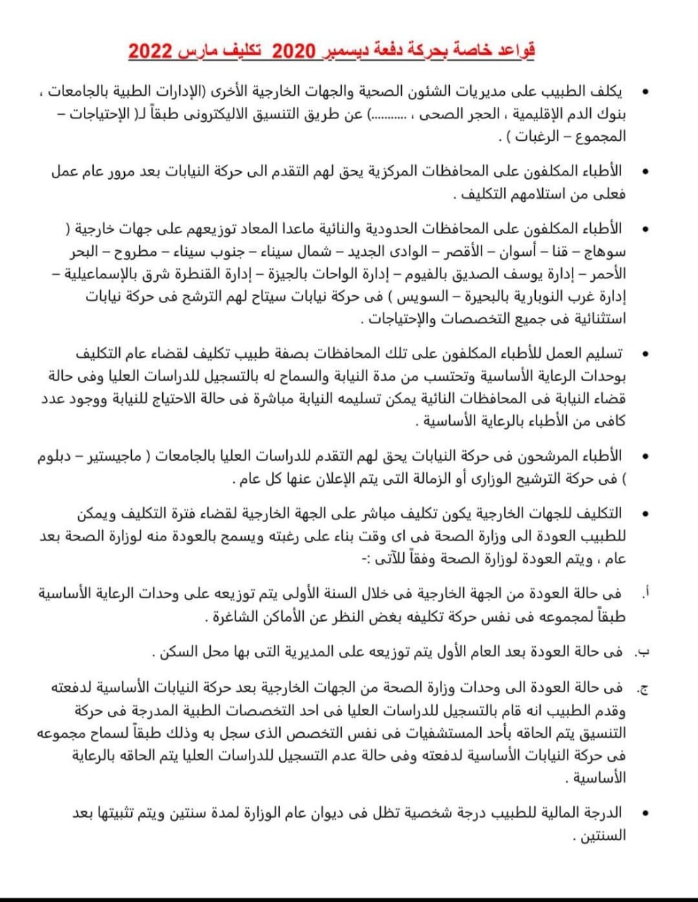 أعلنت وزارة الصحة والسكان بدء التسجيل لبيانات ورغبات الأطباء لتكليفهم بالعمل بوزارة الصحة والسكان، كما أعلنت الوزارة على موقعها الإلكتروني القواعد الخاصة بتكليف أطباء دفعة ديسمبر 2020 تكليف مارس 2020.
