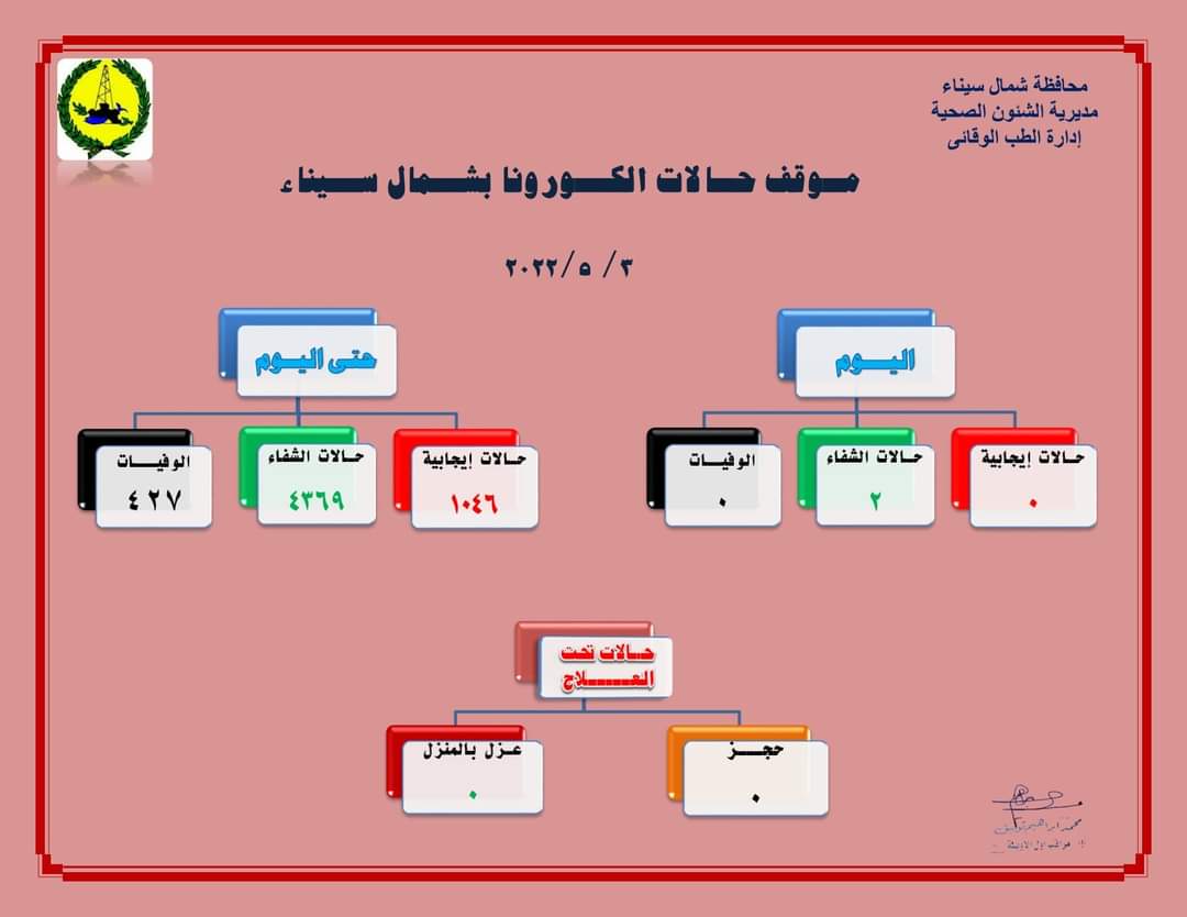 وسجلت مديرية الصحة بشمال سيناء 1046 حالة منذ تفشي الوباء وشفاء 4369 حالة ووفاة 427 حالة مصابة بفيروس كورونا منذ تفشي الوباء على مستوى المحافظة.