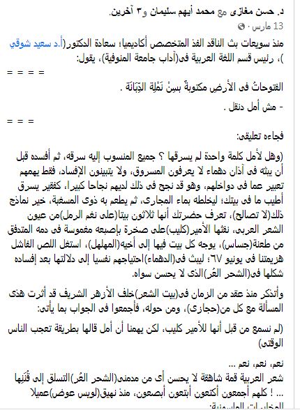 ولا أعلم لماذا اللف والدوران والتعمية على شخص مهاجم أمل دنقل؟ نحن هنا نكشف صراحة لمن لا يعرف أن الدكتور حسن مغازي هو صاحب الهجوم على أمل دنقل، وحسن مغازي لمن لا يعرف أكاديمي وشاعر وعروضي، أنا وأنت نختلف معه كثيرًا كما نشاء، لكن الإصرار على عدم التصريح باسمه وأنه صاحب تلك الأفكار ليس في صالح معارضيه بالأساس، فالقول إنه لا يستحق الرد كما يزعم البعض مرفوض لكون الرجل يفصح عن نفسه ولا يتحدث في الخفاء ويطرح ما يقول تصريحًا لا تلميحًا بل منذ سنوات، ولسان حاله يقول: هل من مبارز؟ وعدم الرد عليه يعني ضمنيًا عجز الطرف الآخر وقلة حيلته والتسليم له، كما أنه أستاذ جامعي وله أرضية الطلابية على الأقل، وتأثيره فيهم يعني اتساع دائرة أفكاره وترسيخها.
