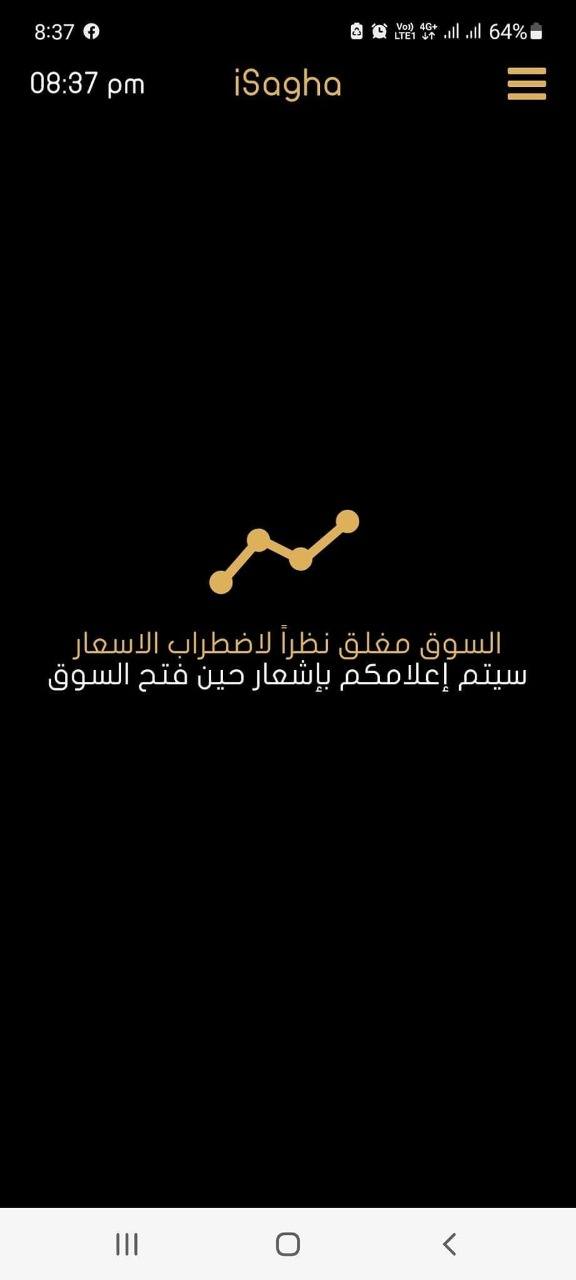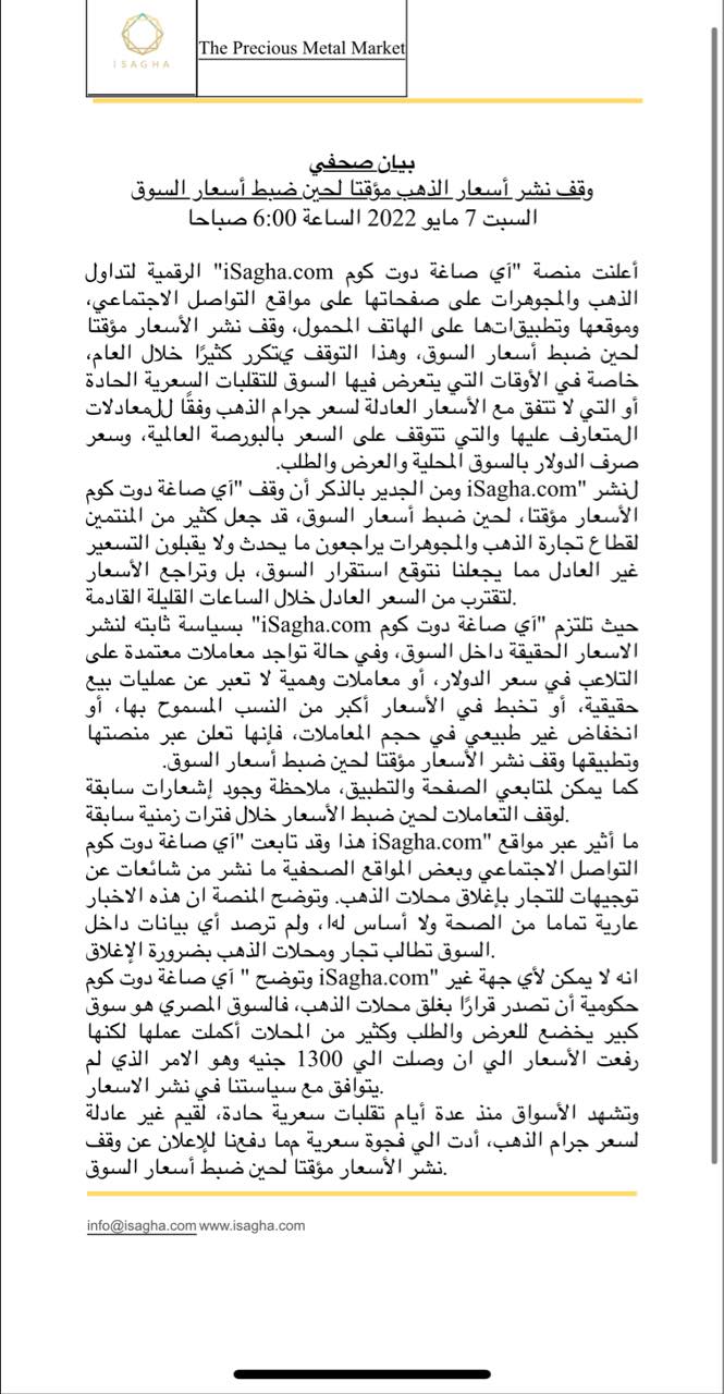وفي وقت مبكر من صباح السبت، أصدر “آي صاغة” بيانًا يقول فيه: “أعلنت منصة آي صاغة دوت كوم iSagha.com الرقمية لتداول الذهب والمجوهرات على صفحاتها على مواقع التواصل الاجتماعي، وموقعها وتطبيقاتها على الهاتف المحمول، وقف نشر الأسعار مؤقتًا؛ لحين ضبط أسعار السوق”.