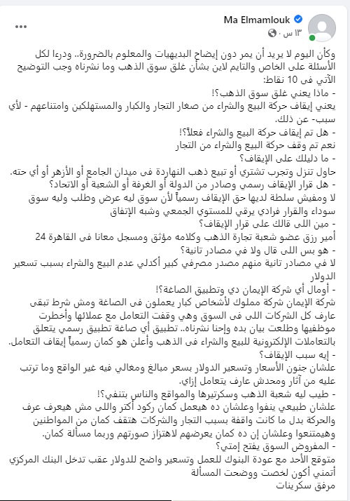 محمود المملوك، رئيس تحرير موقع «القاهرة 24»، كشف، من خلال منشور على موقع التواصل الاجتماعي فيسبوك، التفاصيل الخاصة بانفراد الموقع والأسباب التي أدت لحالة الجدل التي أعقبت نشره، قائلًا "كأن اليوم لا يريد أن يمر دون إيضاح البديهيات والمعلوم بالضرورة.. ودرءًا لكل الأسئلة على الخاص والتايم لاين بشأن غلق سوق الذهب، وما نشرناه وجب التوضيح الآتي في 10 نقاط".