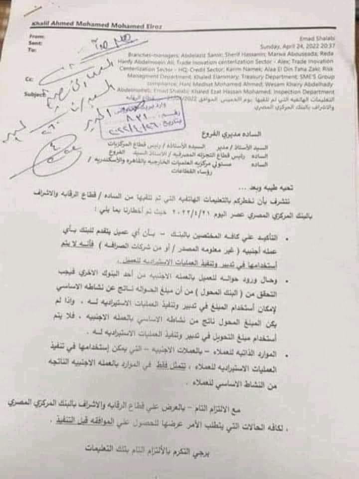 وتضمن الخطاب، الصادر بتاريخ 26-4-2021، أنه حال ورود حوالة للعميل بالعملة الأجنبية من أحد البنوك الأخرى، فإنه يجب التحقق من البنك المحول من أن مبلغ الحوالة ناتج عن نشاطه الأساسي لاستخدام المبلغ في تدبير وتنفيذ العمليات الاستيرادية له، وإذا لم يكن المبلغ المحول ناتجًا عن نشاطه الأساسي بالعملة الأجنبية، فلا يتم استخدام مبلغ التحويل في تدبير وتنفيذ العمليات الاستيرادية له.