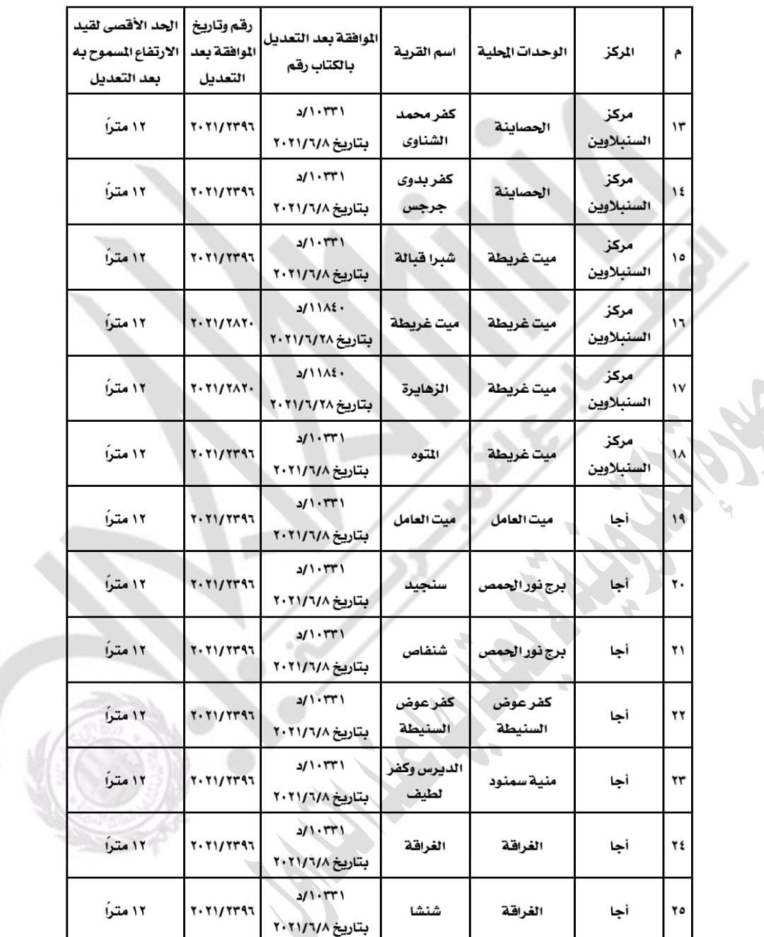 نشرت الجريدة الرسمية في عددها الصادر اليوم 8 مايو لسنة 2022، قرارًا لوزير الإسكان والمجتمعات العمرانية رقم 304، بشأن تعديل قيود الارتفاع بالمخطط الاستراتيجي العام لعدد 34 قرية مـن قرى محافظة الدقهلية بارتفاع 12 مترًا، ووفقا للضوابط والاشتراطات الواردة بموافقة هيئة عمليات القوات المسلحة بوزارة الدفاع وذلك على النحو الوارد تفصيلًا بالجدول المرفق بهذا القرار، علي أن يتم تطبيقه والعمل به من تاريخ 7/4/2022.