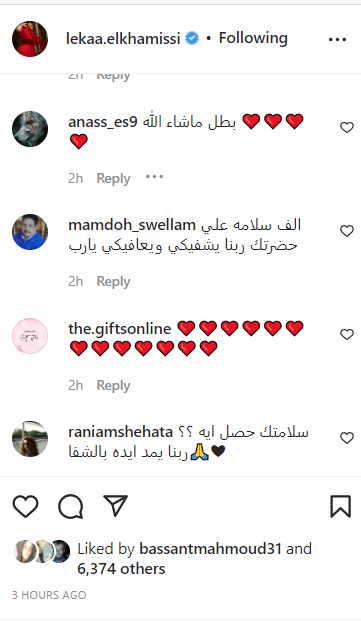 وتفاعل الجمهور مع الصورة، وجاءت العديد من التعليقات التي تدعو لها بالشفاء العاجل، كالتالي: ألف سلامة عليكي، ربنا يقويكي يا حبيبتي، ألف مليون سلامة يا رب تكون بخير.