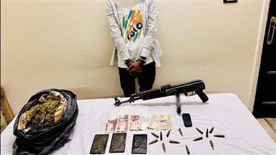 وأمكن ضبطه، وبحوزته 3 كيلو جرام من مخدر البانجو – كمية من مخدر الحشيش - بندقية آلية وعدد من الطلقات النارية من ذات العيار – مبلغ مالي - هاتف محمول.