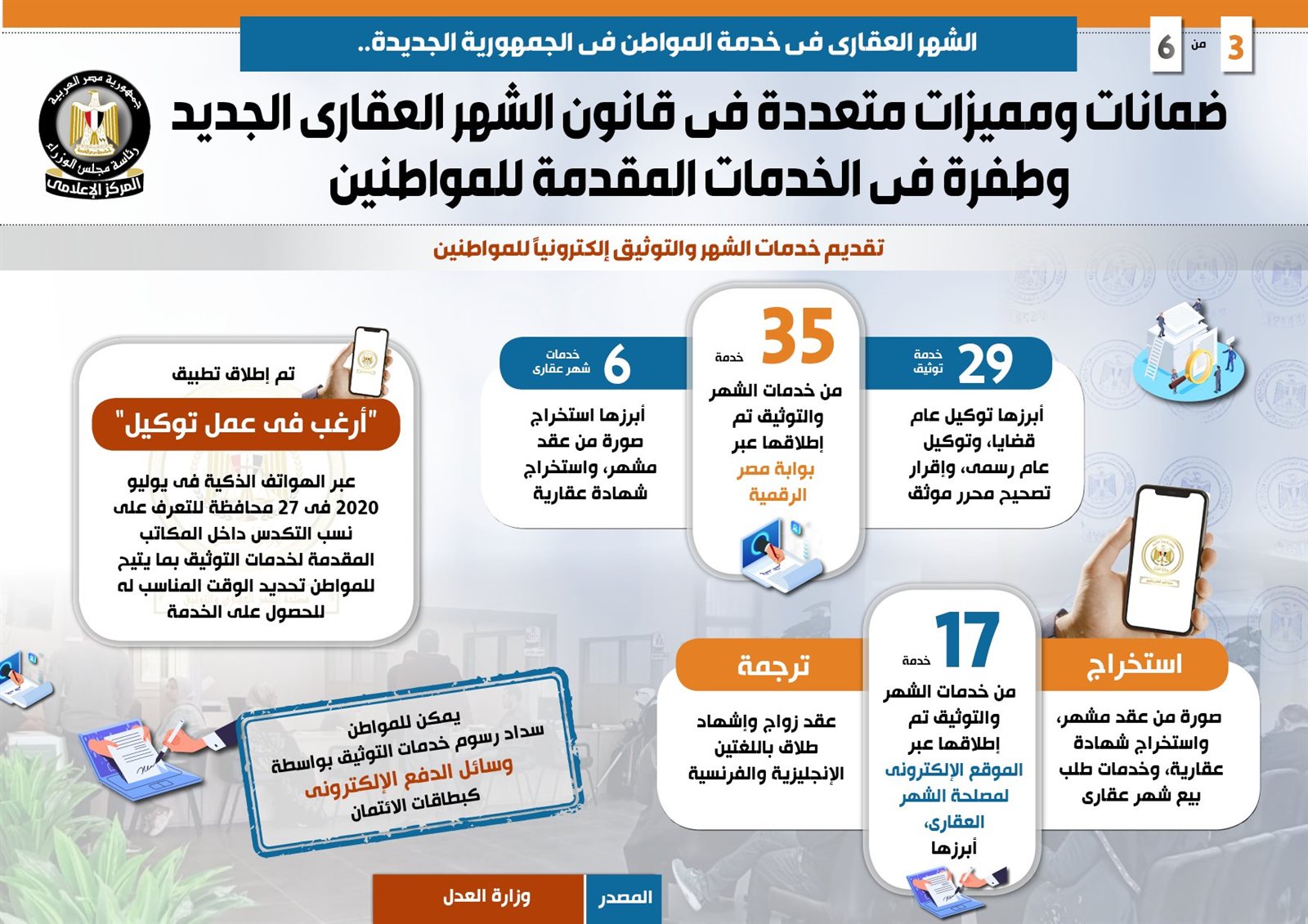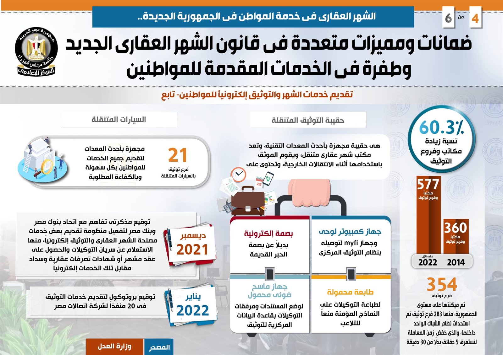 وذكر التقرير أنه تم توقيع مذكرتي تفاهم مع اتحاد بنوك مصر وبنك مصر في ديسمبر 2021 لتفعيل منظومة تقديم بعض خدمات مصلحة الشهر العقاري والتوثيق إلكترونياُ، منها الاستعلام عن سريان التوكيلات والحصول على عقد مشهر أو شهادات تصرفات عقارية وسداد مقابل تلك الخدمات إلكترونيًا، فيما تم توقيع بروتوكول لتقديم خدمات التوثيق في 20منفذًا لشركة اتصالات مصر في يناير 2022.