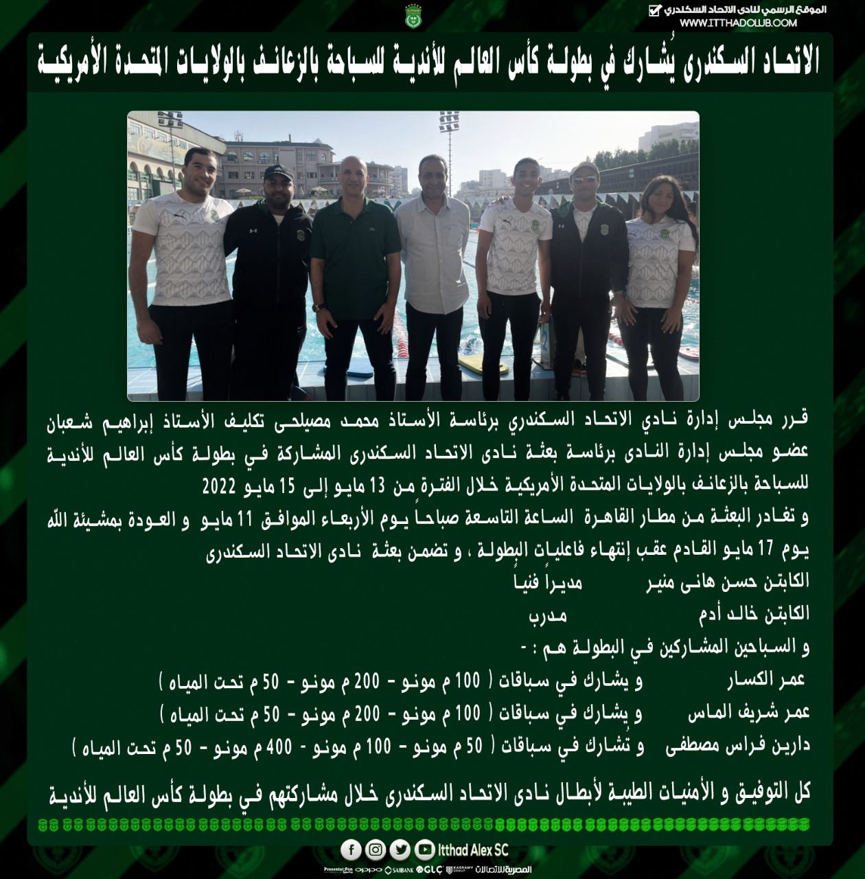 قرر مجلس إدارة نادي الاتحاد السكندري برئاسة محمد مصيلحي، تكليف إبراهيم شعبان عضو مجلس إدارة النادي برئاسة بعثة نادى الاتحاد السكندري المشاركة في بطولة كأس العالم للأندية للسباحة بالزعانف بالولايات المتحدة الأمريكية خلال الفترة من 13 مايو إلى 15 مايو 2022.