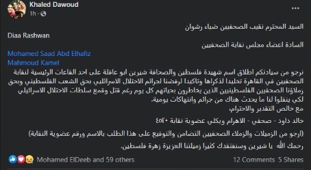 كتب الصحفي خالد داود عبر صفحته الشخصية علي موقع التواصل الاجتماعي فيس بوك: نرجو من سيادتكم إطلاق اسم شهيدة فلسطين والصحافة شيرين أبو عاقلة على أحد القاعات الرئيسية لنقابة الصحفيين في القاهرة تخليدًا لذكراها وتأكيدًا لرفضنا لجرائم الاحتلال الإسرائيلي بحق الشعب الفلسطيني وبحق زملاؤنا الصحفيين الفلسطينيين الذين يخاطرون بحياتهم كل يوم رغم قتل وقمع سلطات الاحتلال الإسرائيلي لكي ينقلوا لنا ما يحدث هناك من جرائم وانتهاكات يومية.