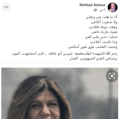 ونعى مفيد عاشور الصحفية الراحلة، عبر حسابه الشخصي بموقع التواصل الاجتماعي فيس بوك، قائلًا: أنا ما هنت في وطني، ولا صغرت أكتافي، وقفت بوجه ظلامي، يتيما، عاريا، حافي.. حملت دمي على كفي، وما نكست أعلامي، وصنت العشب فوق قبور أسلافي.. رحم الله الشهيدة الفلسطينية شيرين أبو عاقلة.. التي استشهدت اليوم، برصاص العدو الصهيوني الجبان.