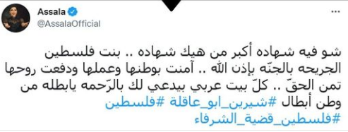 كتبت المطربة السورية أصالة نصري تغريدة عبر حسابها الشخصي بموقع التدوينات القصيرة تويتر، قائلة: شو فيه شهادة أكبر من هيك شهادة، بنت فلسطين الجريحة بالجنة بإذن الله، أمنت بوطنها وعملها ودفعت روحها ثمن للحق، كل بيت عربي لك بالرحمة يا بطلة من وطن أبطال.