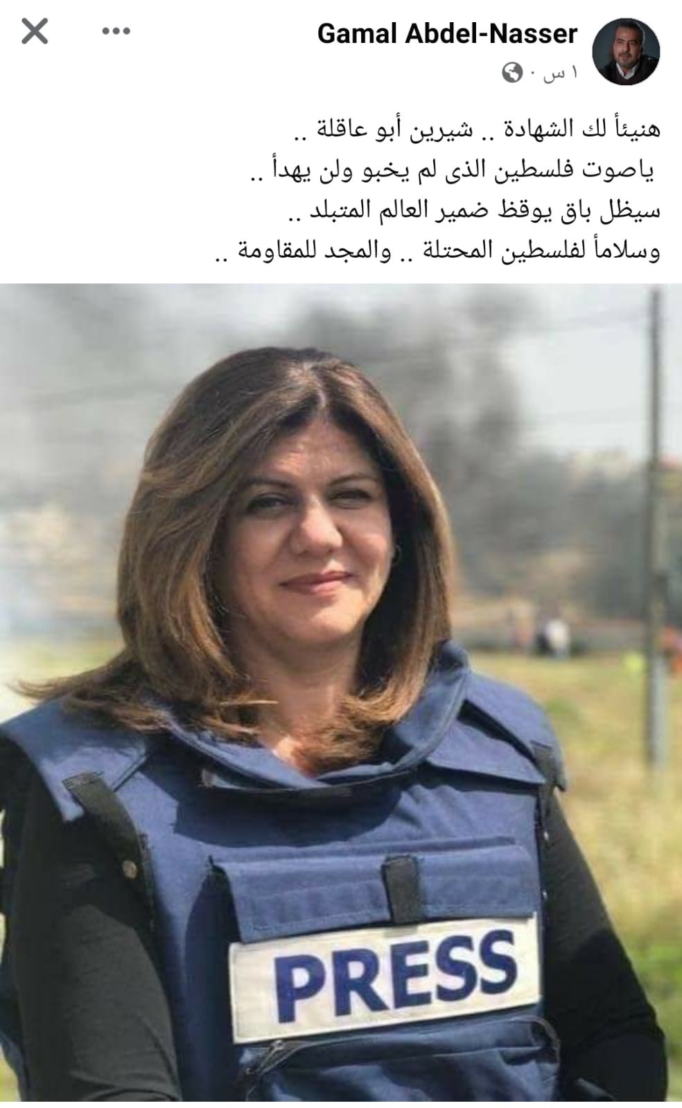 وكتب جمال عبد الناصر منشورًا ينعى في شيرين أبو عاقلة، حيث قال: هنيئًا لك الشهادة، شيرين أبو عاقلة، يا صوت فلسطين، الذي لم يخبو ولن يهدأ، سيظل باق يوقظ ضمير العالم المتبلد، وسلامًا لفلسطينالمحتلة، والمجد للمقاومة.