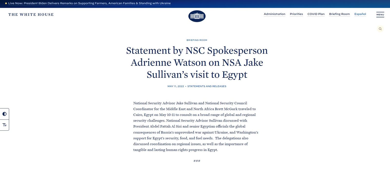 جاء ذلك في بيان لـ المتحدث باسم مجلس الأمن القومي أدريان واتسون حول زيارة مستشار الأمن القومي الأمريكي، جيك سوليفان إلى مصر.