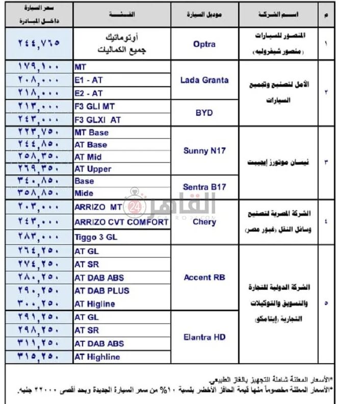 وانطلقت سيارات نيسان صني من 223,750 جنيه، وحتى 269,350 جنيه، وسيارات سنترا من 340,850 جنيه، حتى 358،859 جنيه وسيارة أوبترا وصل سعرها إلى 244,765 جنيه.