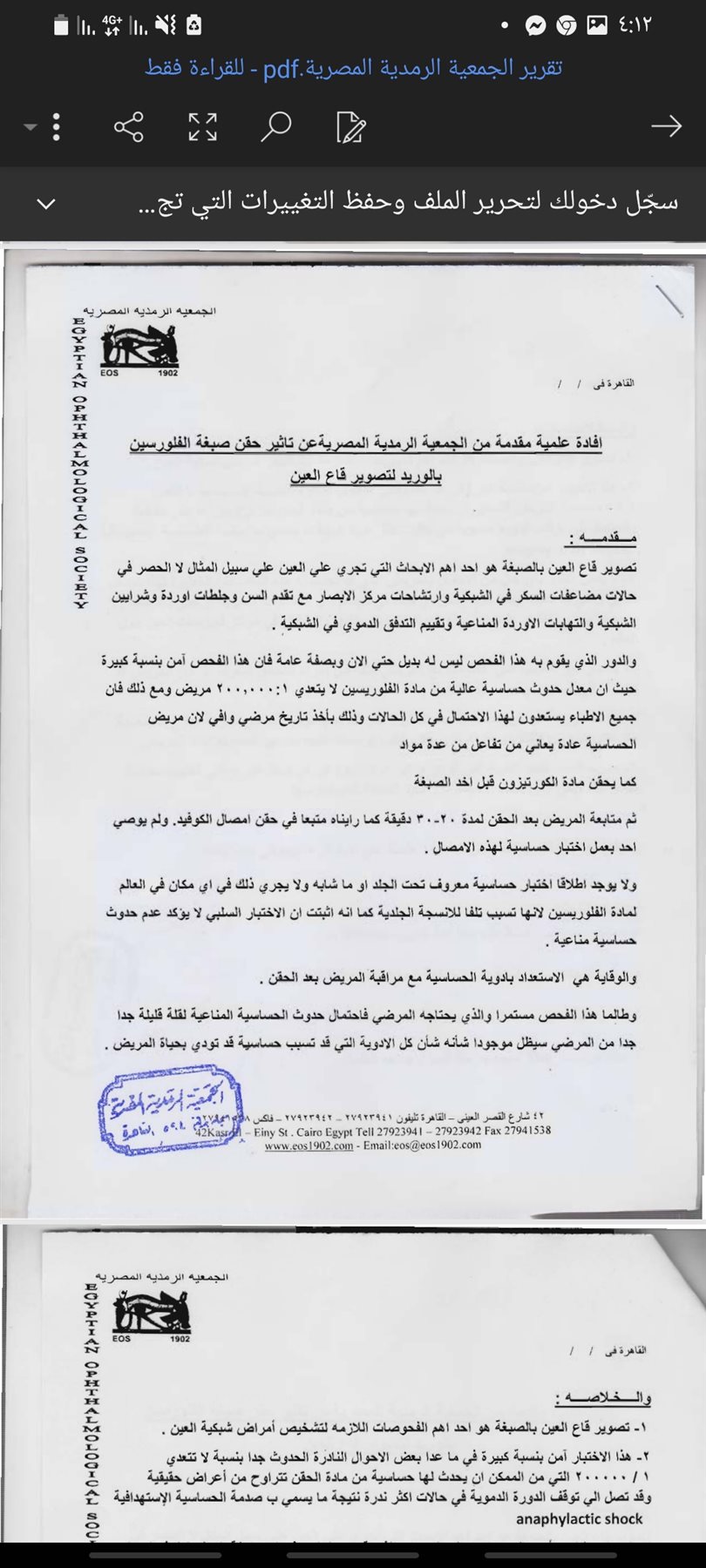 وذكرت في تقريرها عن تأثير حقن صبغة الفلورسين بالوريد لتصوير قاع العين، أن تصوير قاع العين بالصبغة هو أحد أهم الأبحاث التي تجري على العين في حالات مضاعفة السكر علي الشبكية وارتشاحات مركز الابصار وجلطات أوردة وشرايين الشبكية والتهابات الأوردة المناعية وتقييم التدفق الدموي في الشبكية، وأكدت الجمعية الرمدية المصرية أن هذا الفحص ليس له بديل حتى الآن وأنه أمن بنسبة كبيرة.