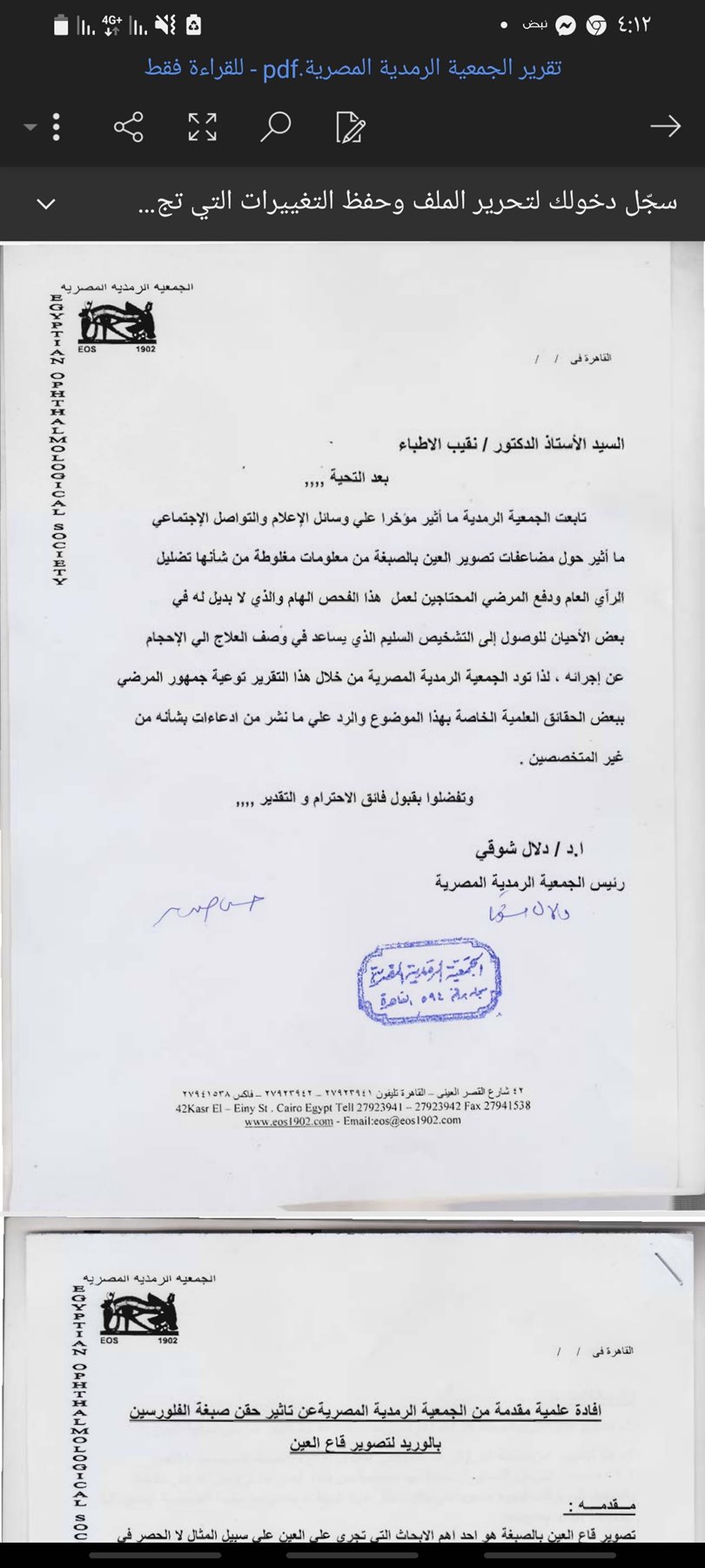 وكشفت نقابة أطباء مصر، أنها تلقت خطابا من الجمعية الرمدية المصرية، اشتمل على تقرير حول ما أثير مؤخرا عن مضاعفات تصوير العين بالصبغة.